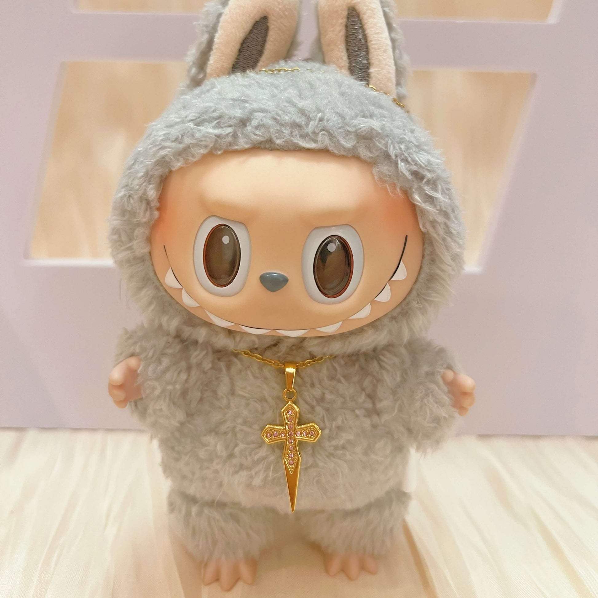 Give your Labubu a “mini luxury” upgrade. This doll necklace features a gold-tone cross pendant with pink crystal detailing that catches light beautifully in photos. The chain sits neatly around the doll’s neck for a clean, layered look—perfect for collectors, outfit styling, and content creation.