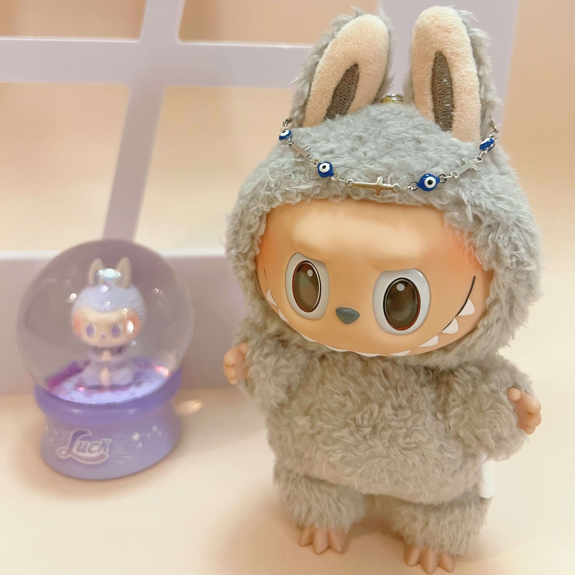 Add a protective-cute vibe to your Labubu looks. This accessory set features blue evil eye beads paired with sleek cross charms in a shiny silver-tone finish. The bracelet has an adjustable extender chain for flexible styling—use it as a doll accessory (neck/head styling) or as a mini fashion detail in your flat lays and content.