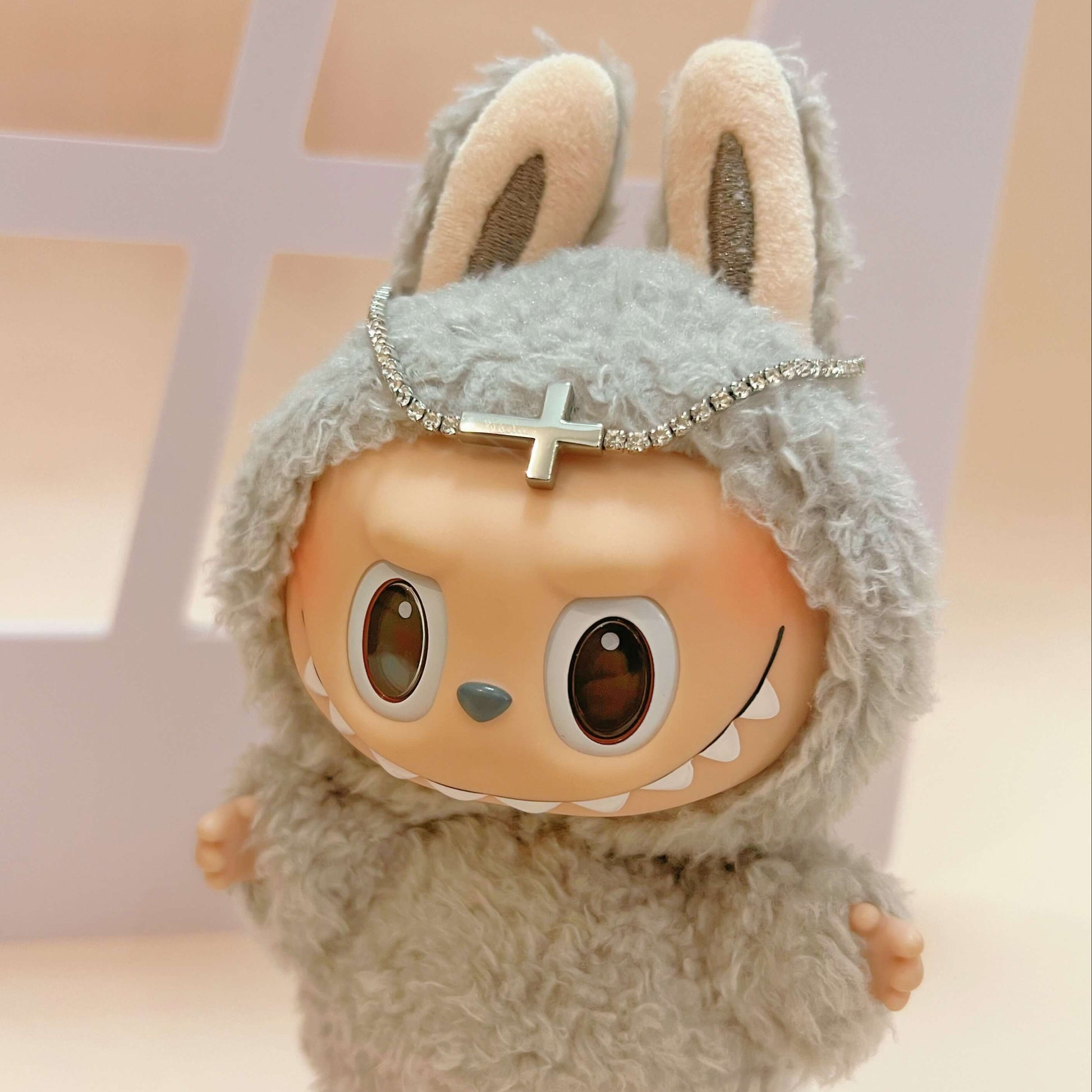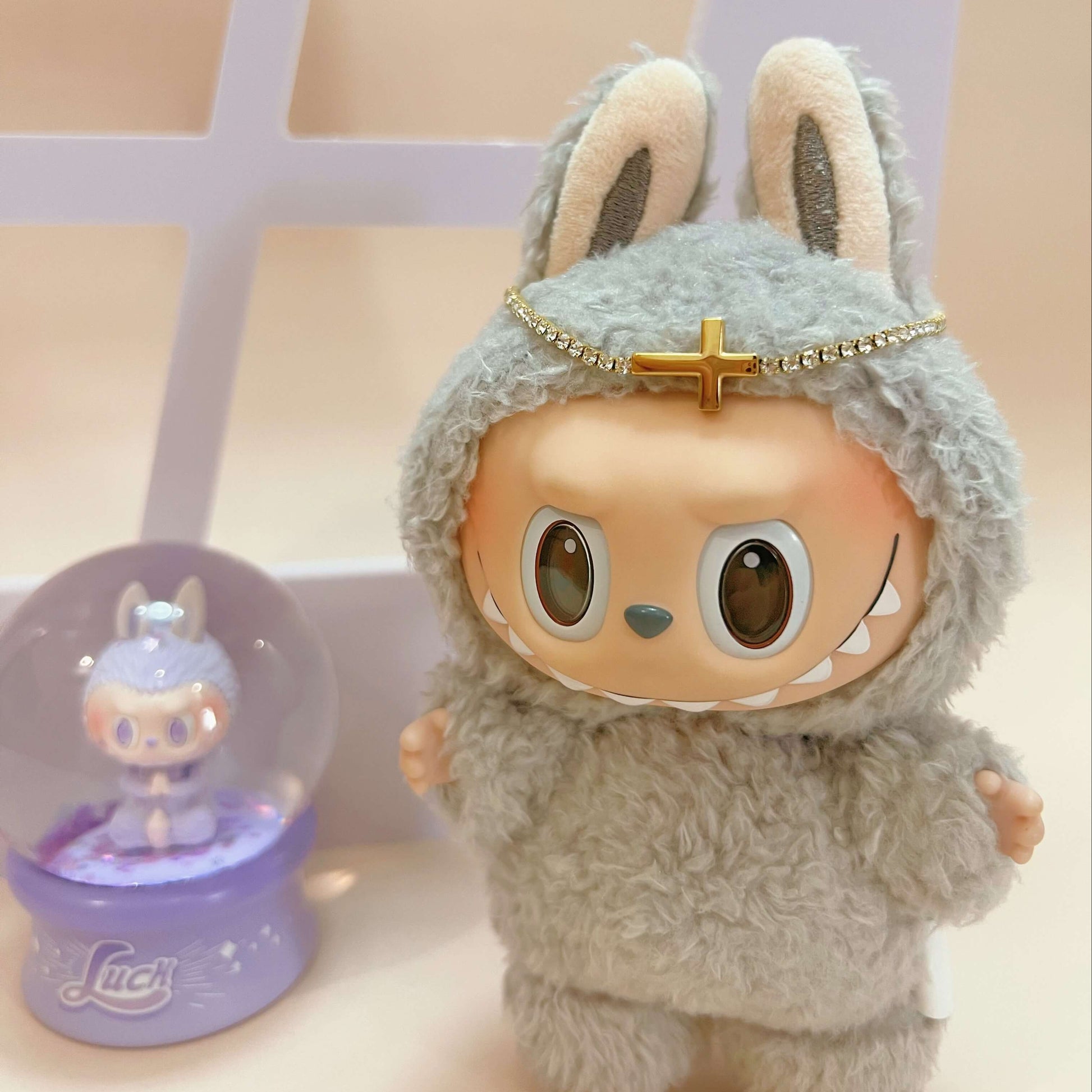 This mini head chain crown features a rhinestone cross centerpiece—perfect for styling “Labubu-size” dolls and other similar 17cm plush figures for photos, display, or gifting.